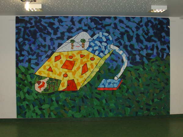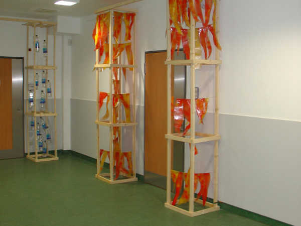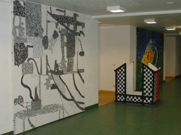 An unterschiedlichen Orten in der Schule entstanden erlebnisreiche Plätze, die sich auf und mit dem Ort bezogen und oben aufgeführte Themen behandelten. Die Räume und Raumteile wurden mit künstlerischen Objekten bestückt oder selbst zu einem Kunstobjekt.