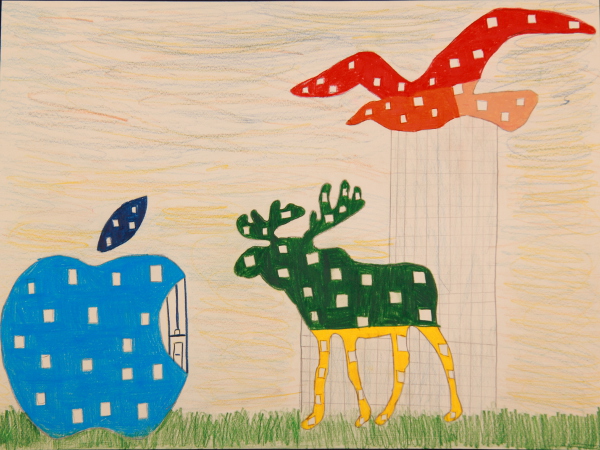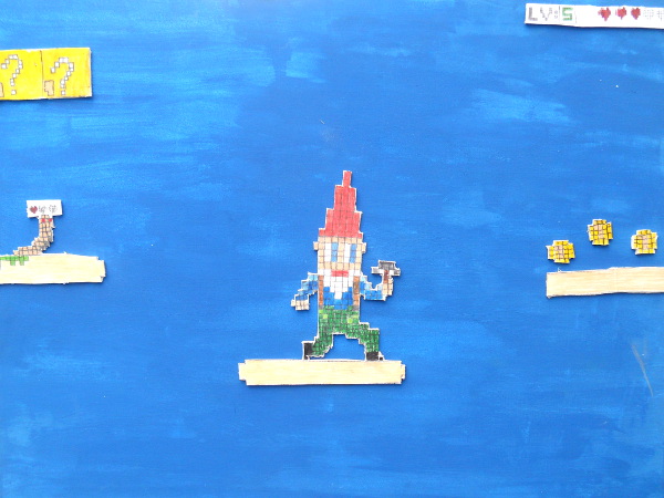 sind Beispiele. Zu diesen Themen haben die Schülerinnen und Schüler ein Jahr lang reale oder visionäre Ideen gesammelt und versucht dazustellen. Dabei haben sie Zukunftsstädte gezeichnet, diese Arbeiten wurden fotografiert und auf Alubondplatten kaschiert, sie sollten im Außenbereich der Schule montiert werden, der Architektenschutz des Gebäudes, verhinderte das. Danach ging es dem deutschen Gartenzwerg an den Kragen, mit Linoldruck, Zeichnung, Schablonentechnik, Leinwand und Ton, fand der Gartenzwerg seine Beurteilung in den Arbeiten. In unmittelbarer Nähe befindet sich der "Kleingarten" hier realisiert auf 1 m x 1 m = 1 m². Vielleicht hat der QR-Code nichts mit unserer Lebensumgebung zu tun, jedoch ist er ein Kommunikationsmittel, welches immer weiter in unser Leben eindringt.