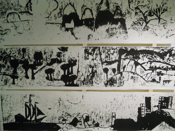 In diesem Sinne haben die Schülerinnen und Schüler große Holzschnitte gefertigt. Diese waren, wegen ihrer Größe von 200 x 50 cm, technisch sehr anspruchsvoll. Es entstanden Bilder von Naturlandschaften, Städten und Meeren.